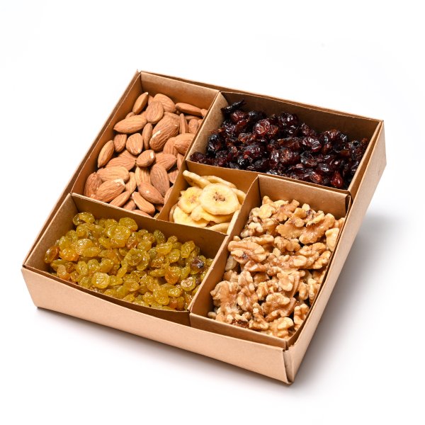 שקדים, צימוקים, חמוציות, אגוזי מלך ובננות מיובשות לקישוט.
