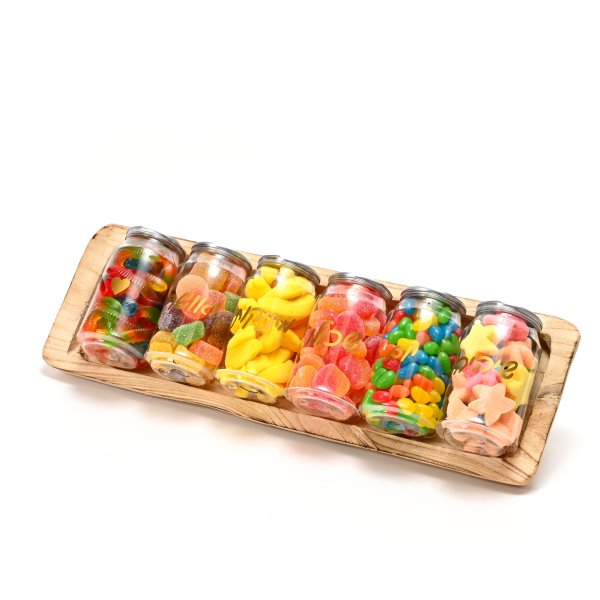 על הפחיות הדפס מילים שיוצר משפט לאורך המגש.